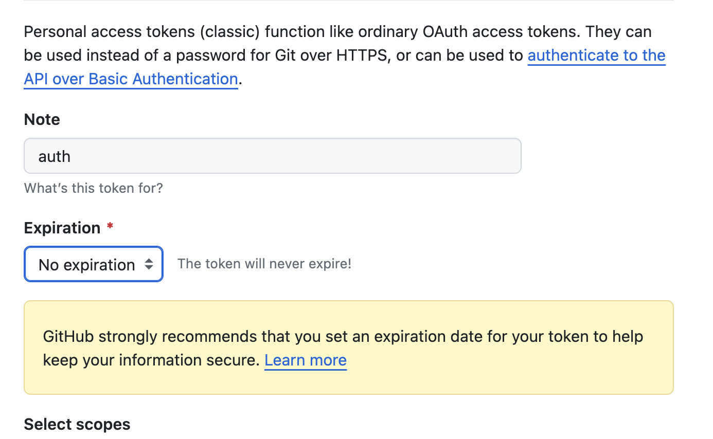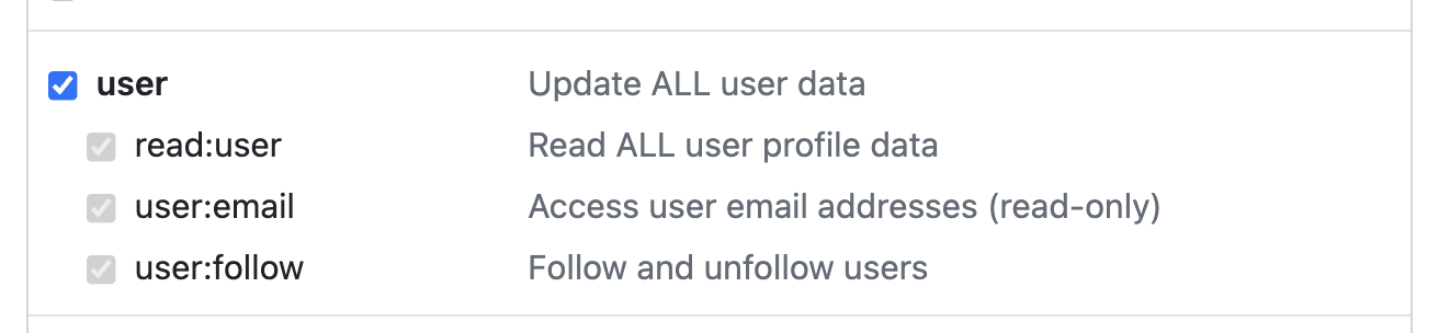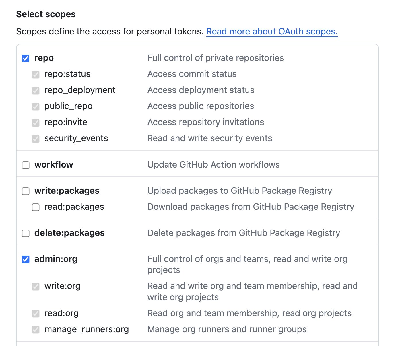 4. token select scopes "repo, admin.org, user" 선택 후 토큰생성