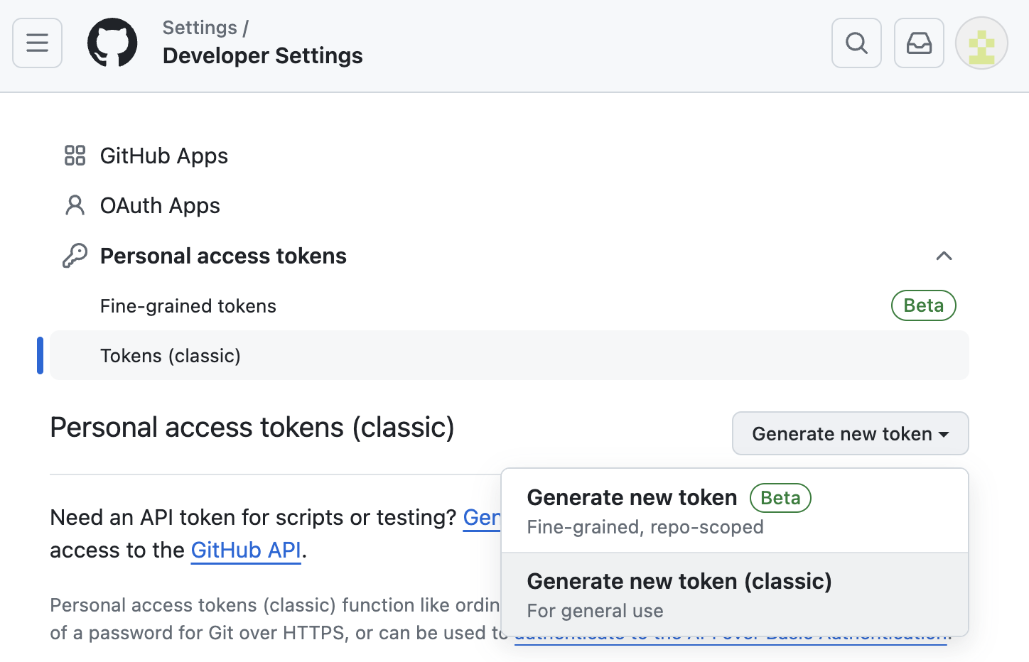 2. personal access tokens -> tokens -> generate new token -> generate new token
