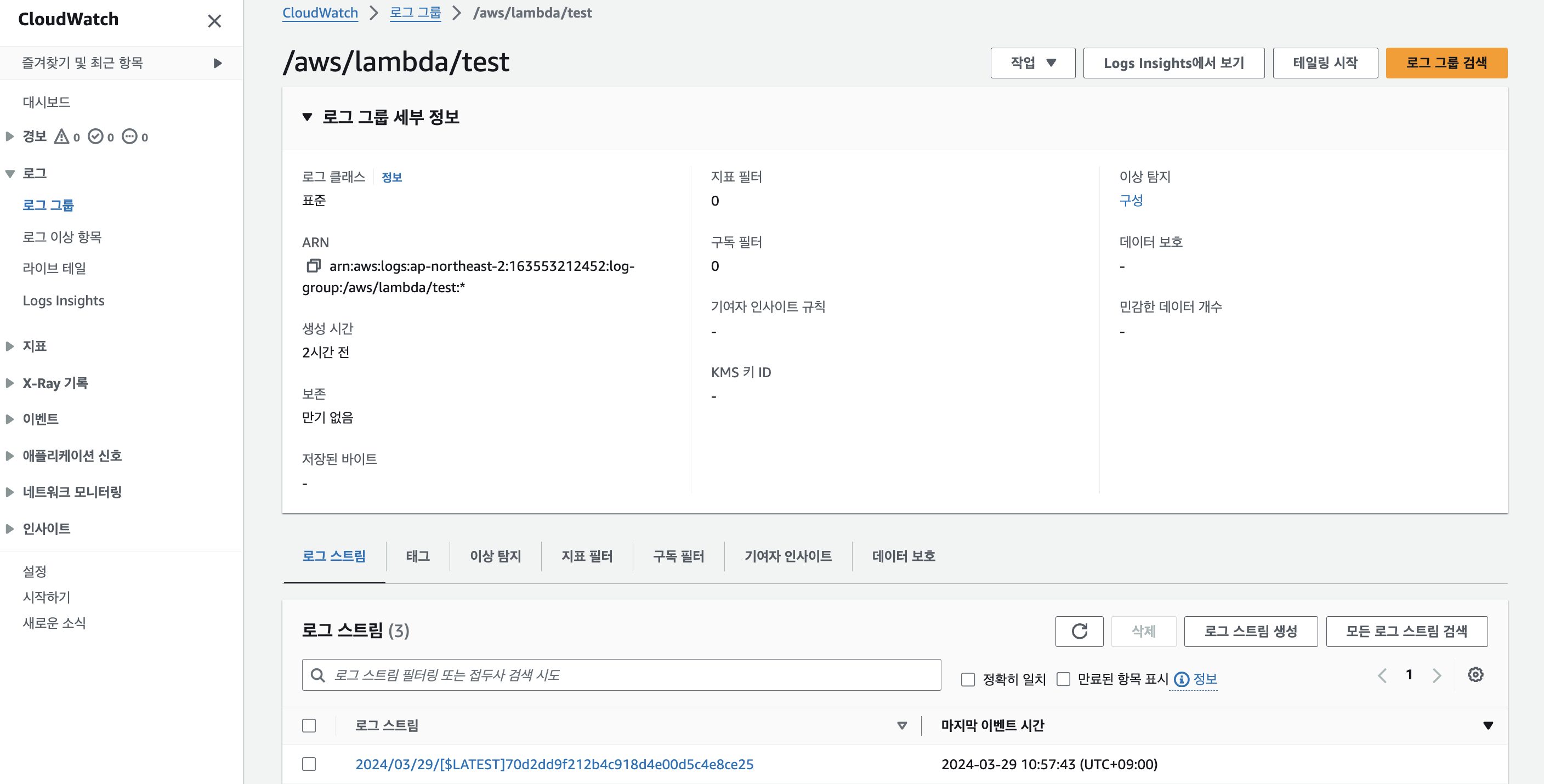 3. S3에 파일을 적재 후 로그스트림이 생성된 것을 확인되면 EventBridge 테스트는 성공적으로 완료된 것을 볼 수 있다.