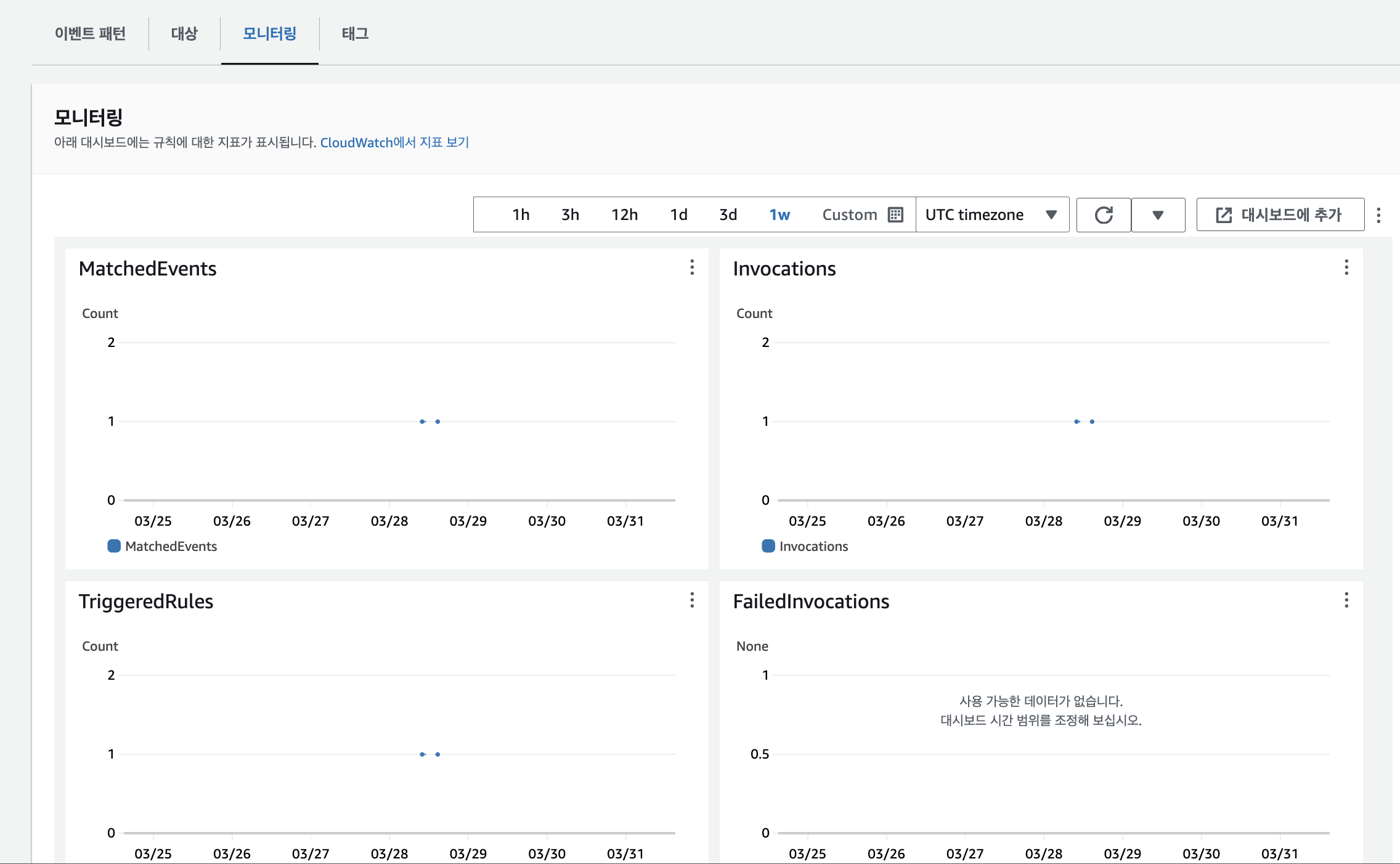 첫 번째. EvnetBridge 모니터링으로 확인 가능하며 시간을 커스텀하며 확인할 수 있다.