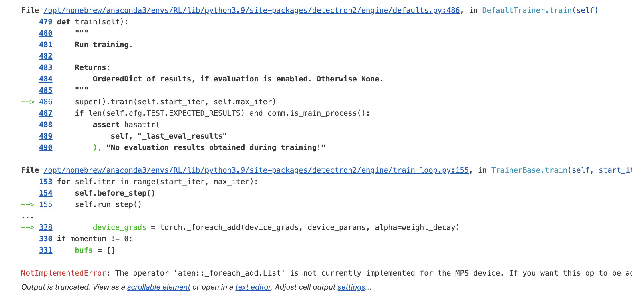 생전 처음 보는 에러. mps가 구현되지 않아서 github에 올리라는 메세지 - NotImplementedError: The operator 'aten::foreach_add.List' is not currently implemented for the MPS device. If you want this op to be added in priority during the prototype phase of this feature, please comment on https://github.com/pytorch/pytorch/issues/77764. As a temporary fix, you can set the environment variable `PYTORCH_ENABLE_MPS_FALLBACK=1` to use the CPU as a fallback for this op. WARNING: this will be slower than running natively on MPS.