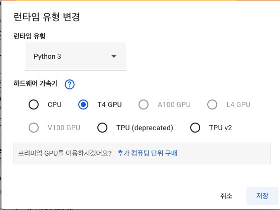 2. GPU를 사용하기 위해 런타임 유형을 T4 GPU 변경한다.